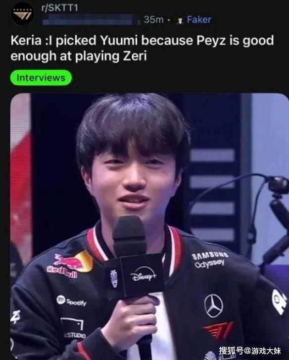 赛后采访中,Keria谈到这一手猫咪选择时表示:“我选猫,是因为Peyz的泽丽玩得够好。”这原本是一句非常中性的评价,既解释了BP思路,也顺带肯定了AD选手的个人能力,然而在韩国论坛和社交平台上,这句话却迅速被“过度解读”,不少网友认为,这番话的潜台词是:过去T1之所以很少拿出泽丽加猫咪,并非体系不强,而是当时的AD并不足以支撑这一套打法。