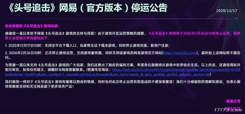 近日由Theorycraft工作室研发,网易代理的《头号追击》宣布,因为经营策略的调整,游戏将于2026年2月26日停运。《头号追击》是一款MOBA吃鸡游戏,于2025年7月24日上线国服和steam平台。