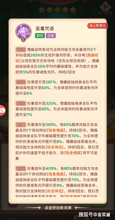 傀儡巫师:打三,召唤物活着的时候,减伤buff,3星增加相当于压制对方最高输出的效果,5星概率100%,召唤物死亡给对方减一回合攻击,召唤物死了不会再召唤,低星不推荐,最少3星起用,要用就升5星
