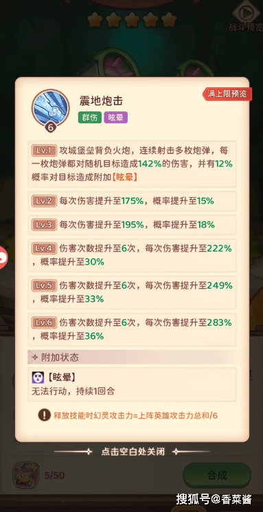 攻城堡垒:随机目标,概率晕眩,1-2星打几下介绍没说清除,直接说3星6下,随机,伤害倍率不低,200%多6下,控制概率低,而且目标随机,硬控效果太随机了,不如指定性强概率高的软控,如果指望它来起控制效果,赌运气成分有点高