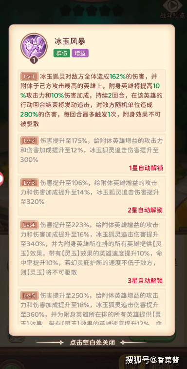 冰玉狐灵:全伤,增益,3星之后增益一排,3星之后,阵容站位就是123或者141站位了,1星增伤效果不错,3星增益一排,值得3星,4,5星成长太小不值得