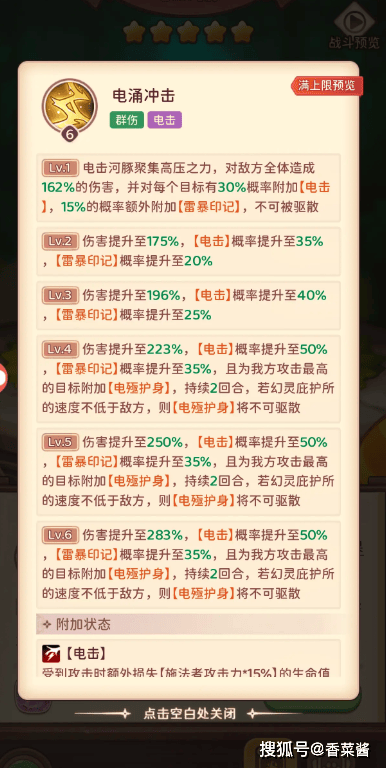 电击河豚:全伤,给对方加电击buff,3星给己方添加护身buff,给对方相当于易伤buff,给已方最高攻添加减伤保护,4星5星只是加了点伤害,要养的话,到3星就可以,4、5星提升太小