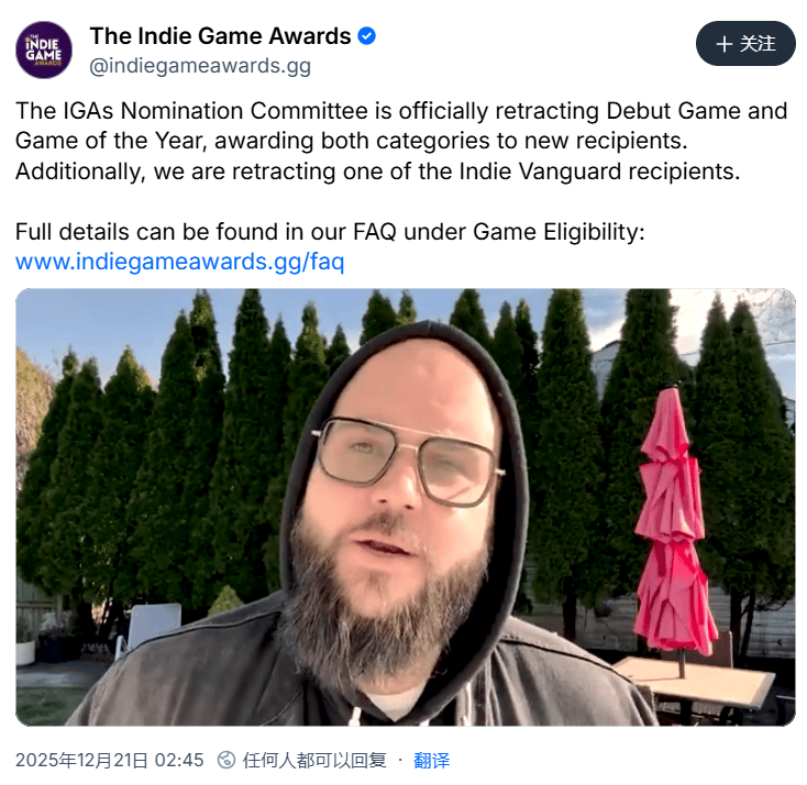 独立游戏大奖的团队在官网上发布了一段视频和一份声明,称尽管《光与影:33 号远征队》的AI素材已被移除,游戏本身也足够优秀,但确实违反了相关规定。