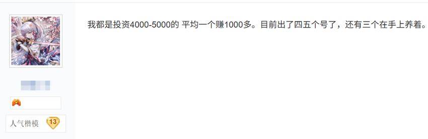 没错,《率土之滨》账号的高保值率,不仅在整个SLG圈出了名,还催生了一种全新的“养号流”。一些有较多空闲时间多的玩家,会先在平台上购买练度较低的成品号,再拿来自己打活动、练阵容,就能以更高的价格赚一手差价。隔壁贴吧就有一位深耕“养号流”的吧友,一个账号就能轻松入手一千多。