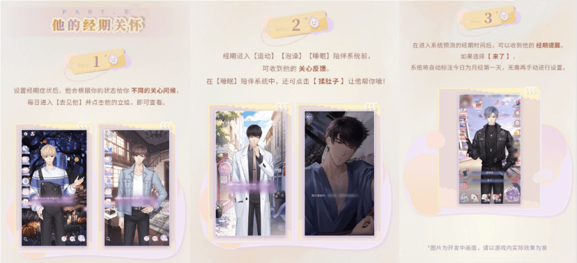 今年夏天,《恋与制作人》推出了运动陪伴系统,系统中内置了跟练课程,升级陪伴的同时,加入健康生活的理念和科学运动的指导。此外,八周年还上线了的“泡澡陪伴系统”和“经期系统升级”,在新升级的经期系统中,除了基础的记录数据和预期经期,玩家还可以记录自己的经期症状。经期期间游戏内不同的陪伴系统会有联动反馈,给到玩家更加沉浸式的陪伴与关怀。《恋与制作人》围绕“真实情感连接”构建的陪伴体系,已成为深入玩家日常生活、提供深层情绪价值的重要支撑,并深刻影响了同类产品的设计思路。