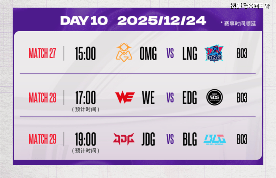 12月24日,三场比赛由OMG对阵LNG,WE对阵EDG,以及重头戏JDG对阵BLG带来。在率先结束的第一场比赛中,OMG明显不想赢,LNG三局战胜OMG;EDG零封WE;那么,JDG和BLG他们谁又会笑到最后呢,让我们拭目以待。