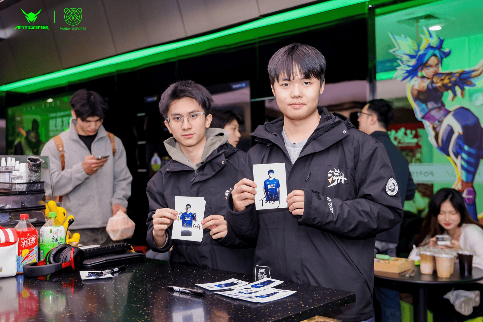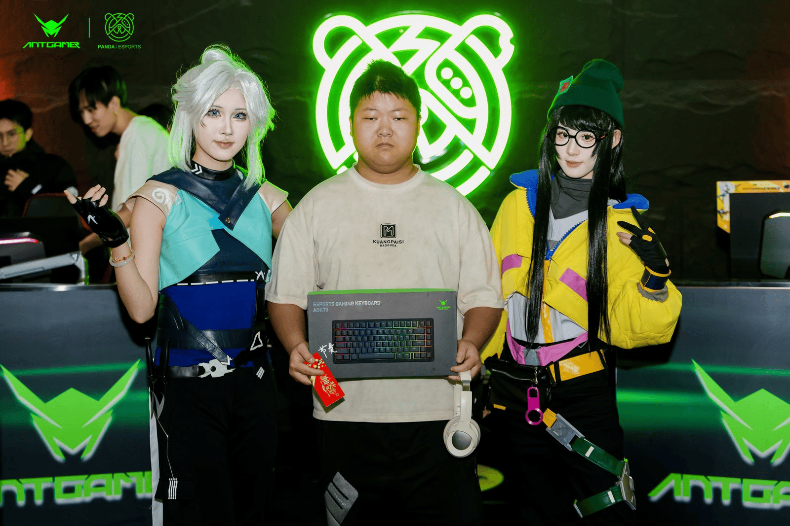 武汉PANDA电竞中心的现场,从进门起就写满了“电竞仪式感”:身着无畏契约角色服装的COSER守在入口,玩家刚签到就能和“奇乐”“捷风”合影打卡,不少人举着蚂蚁电竞周边道具,凑在角色立牌前还原游戏名场面。