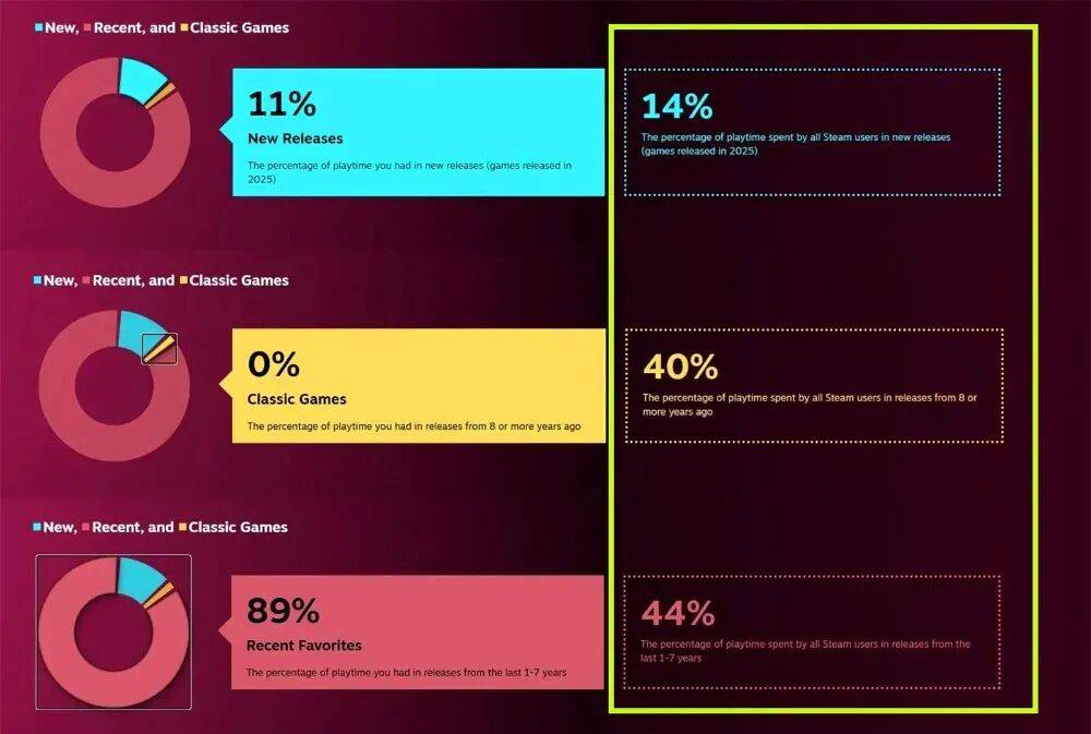 先看第一组:根据Steam2025年度回顾报告,所有Steam用户在2025年新作上的游玩时长,仅占总时长的14%,剩余时长则全部投入到了2024年及更早发售的游戏中。同时,所有Steam用户的平均游玩游戏数量仅为4款。