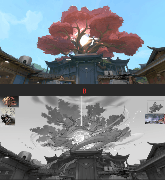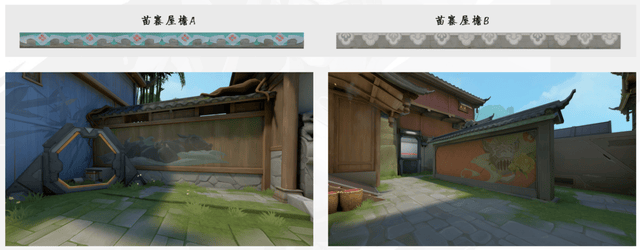 以《无畏契约手游》独有的国风地图“古寨”为例,设计师巧妙地运用冷暖色调区分攻守双方,墙壁绘画也各有不同。为了保持色调的一致性,避免地图元素干扰游戏进程,设计师对取材地的屋檐样式进行了化用,舍弃了突兀的白色,转而采用与地图整体风格更为契合的绿色。