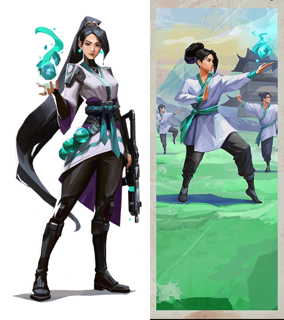 在背景设定中,贤者曾于道观里静修多年,服饰自然也要从道家练功服中汲取灵感。不过,传统练功服下摆较长,不利于实战机动,因此设计师将其改良为短裙样式,既保留了东方气韵,也贴合了战术需求。