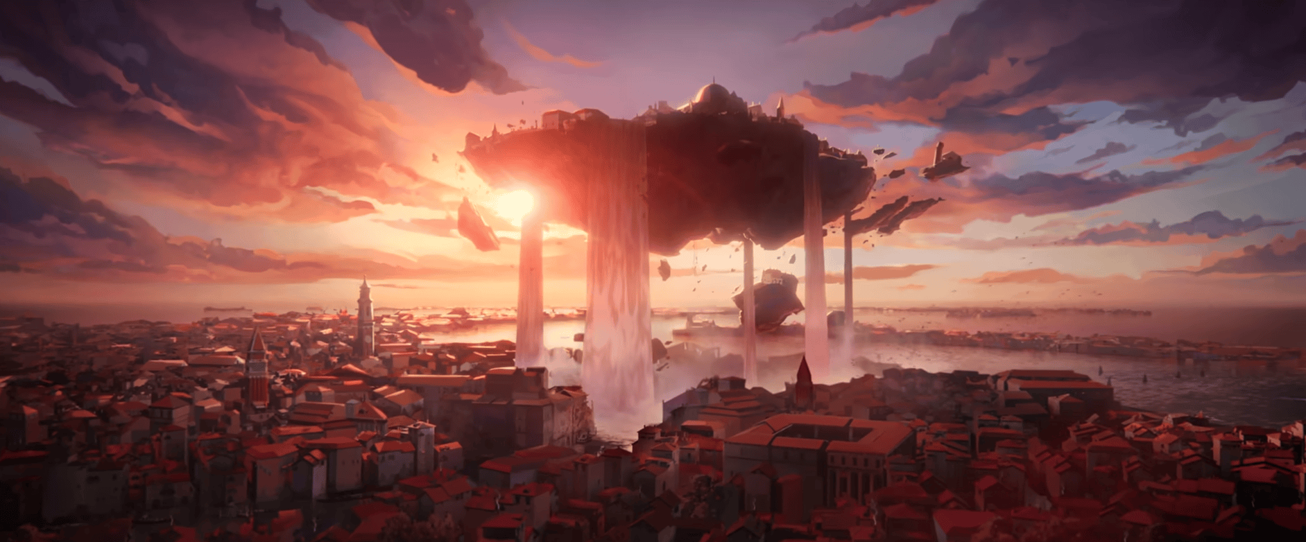 我们上面提到,为了竞技性考虑,瓦手地图的主体部分,必须保持简洁。而那些地图不可互动的部分,就是设计师展示业务能力的时候了。微风岛屿里阳光穿过棕榈叶的海岛风光;亚海悬城里整座城市漂浮在空中的视觉奇景;霓虹町高低错落的城市设计,都在游戏里恰如其分地呈现了出来。
