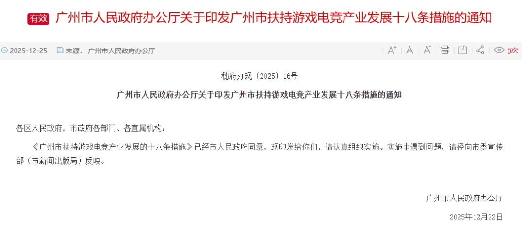 刚刚,广州发布支持游戏产业的18条措施《广州市扶持游戏电竞产业发展的十八条措施》(以下简称措施),已下发相关单位。
