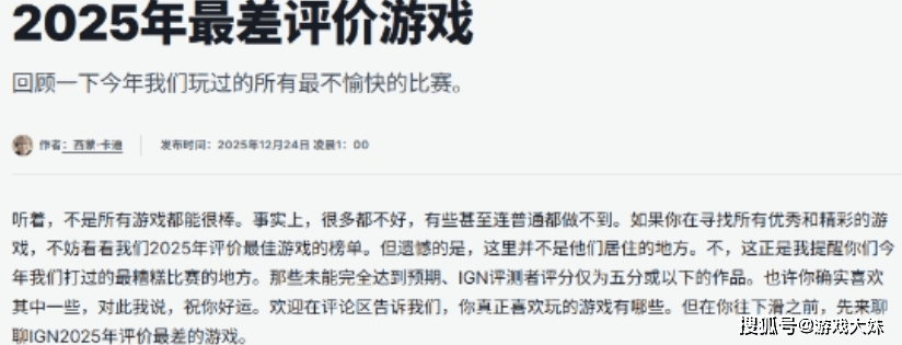 IGN评选2025年最差游戏排行,一款国产游戏上榜,仅获得5分,IGN这份“2025年最垃圾游戏”回顾榜一出来,多少还是让人有点复杂情绪,一方面,确实如它所说,今年没有出现低于4分的“史诗级灾难”,说明整体工业水准在托底,但另一方面,这一长串5分、4分作品,也清楚地提醒着玩家:大厂和IP光环,依旧救不了一款从根子上出问题的游戏。