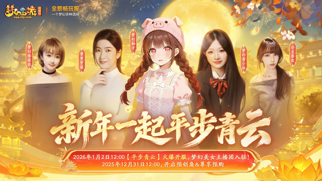 新年新气象,三界添风华!新服【平步青云】诚邀五位才貌双全的人气女主播,组成“梦幻美女主播团”,陪伴各位少侠跨年喜迎新春、共闯梦幻三界!
