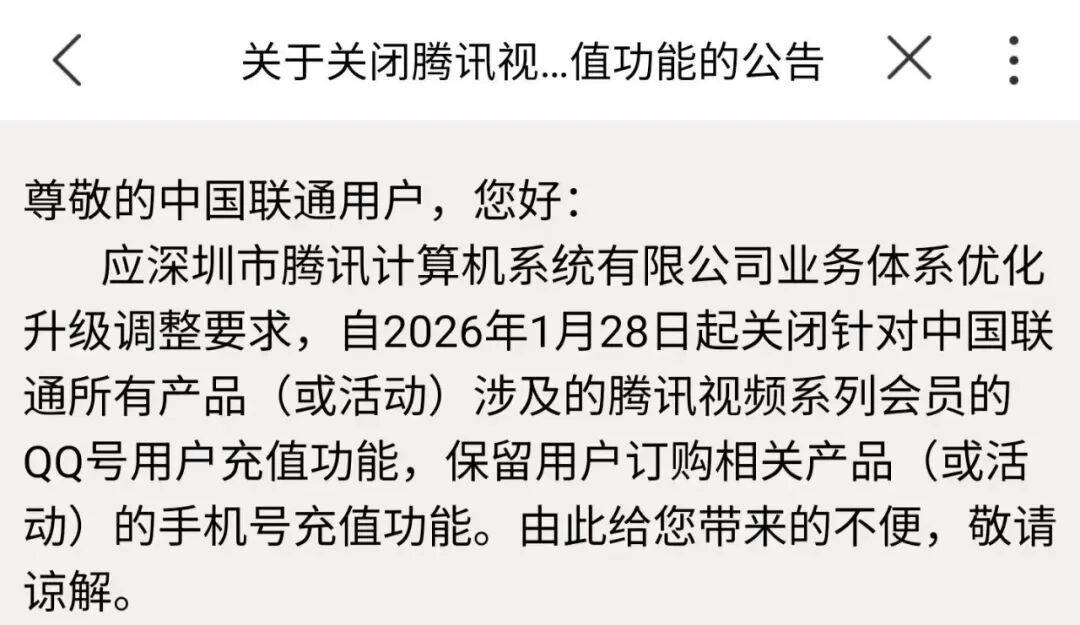 中国联通发布公告称,自 2026 年 1 月 28 日起,关闭针对中国联通所有产品 (或活动) 涉及的腾讯视频系列会员的 QQ 号用户充值功能。