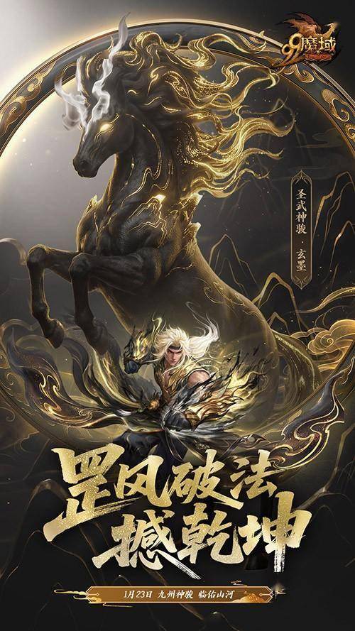 圣武神骏·玄墨:黑金配色,气势刚猛。设定强调“拳出如烈马奔腾”,人形原画中双拳缠绕墨色罡气,一看就是高输出定位,适合喜欢正面攻坚的玩家。