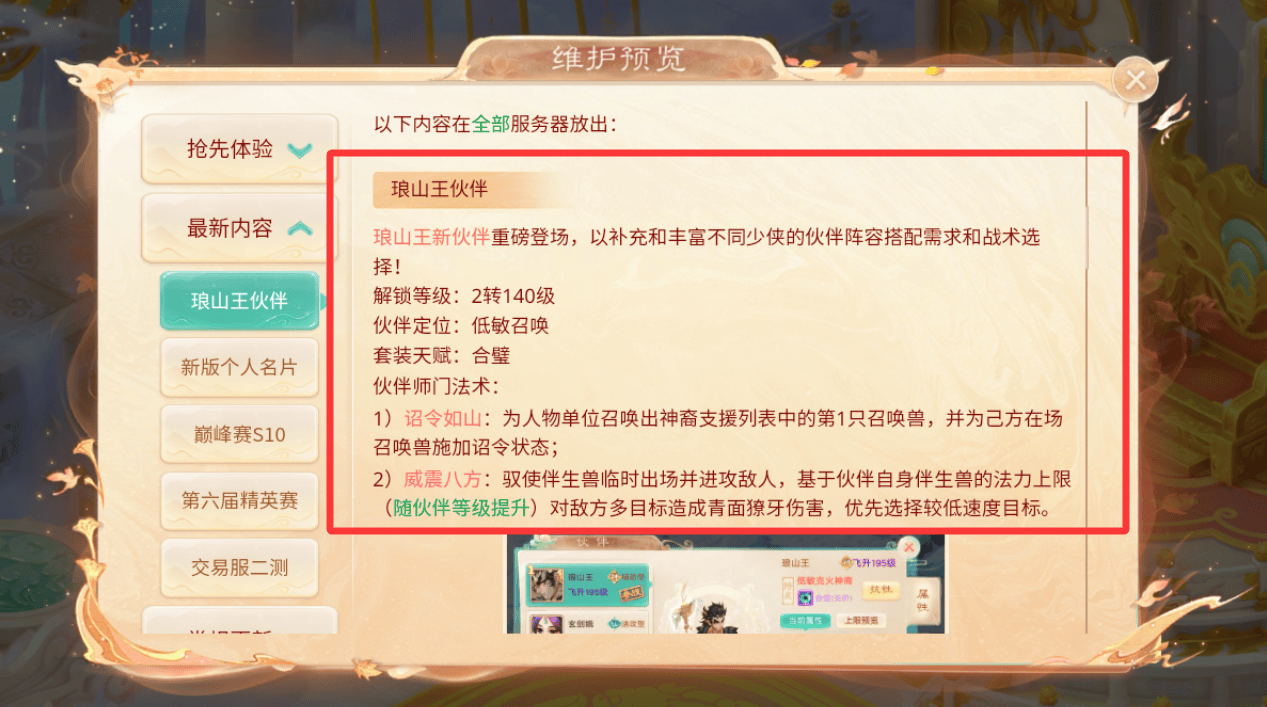 叶子猪在维护预览中看到,神族伙伴琅山王,定位低敏克火神裔,解锁等级:2转140级,套装天赋:合璧,师门法术只有诏令如山和威震八方,没有附加神恩,两大师门法术直指PK与任务痛点: