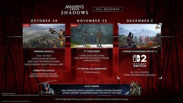 育碧正式公布《刺客信条:影》秋季更新路线图,详述了从即日起至2025年末的一系列更新计划、限时活动与新增内容。继近期新增"新游戏+"模式、时间跳跃功能及"淡路之爪"扩展包获得成功之后,工作室持续提升游戏自由度与重复可玩性。本季更新将包含第二轮跑酷系统革新、新增游戏内活动,以及备受期待的任天堂Switch 2版本。