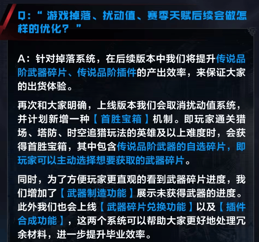 一是扰动值,这个「越刷收益越低」的设计本身是为了降肝,让玩家每天有规划和限度的刷宝,但真正喜欢刷宝的玩家会觉得「收益在减少,最低都不怎么出货」,变成了负面反馈。后续我们会取消扰动值设计,提升传说武器碎片、传说品阶插件的产出效率;