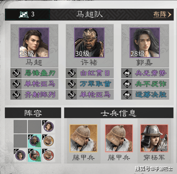 布阵是虎痴索命队发挥协同效果的基础,无论英雄还是兵种站位,都围绕“最大化追击触发”与“保障核心生存”两大原则展开。英雄站位上需严格遵循核心逻辑:马超与郭嘉不占用追击格,许褚则必须精准落位于两人的追击格交汇处,唯有如此才能稳定触发联动效果,确保后续爆发伤害的连贯输出,若许褚站位偏离,整个阵容的输出节奏会直接断裂,定点秒杀目标无从谈起。兵种搭配同样关键,连弩军需部署在许褚的追击格内,借助许褚的输出节奏触发协同攻击,进一步放大爆发伤害;藤甲兵则要前置在许褚与连弩军前方,凭借较强的防御能力承担敌方主要伤害,为后排输出创造稳定环境,一旦藤甲兵站位过远无法覆盖核心,后排极易被敌方集火秒杀导致阵容崩盘。
