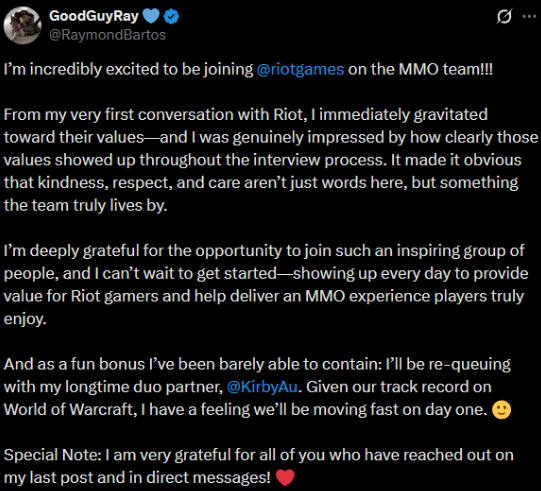 时至今日,拳头MMO项目正式官宣已5年之久,但从种种消息来看,其开发进度仍处于中早期阶段,距离真正面世仍有相当长一段时间。但愿Raymond Bartos的加盟,能为该项目带来一些新变化。