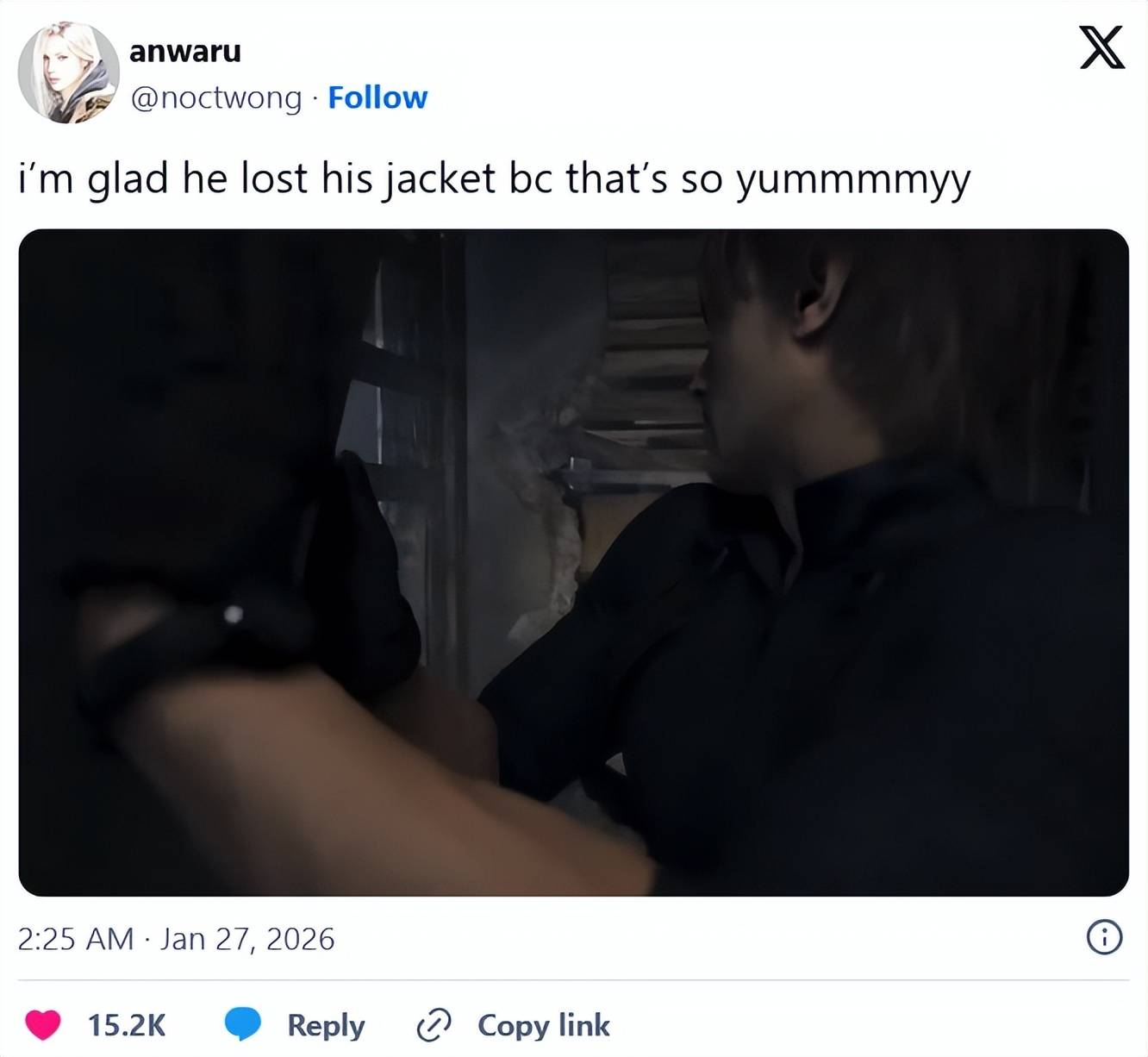 里昂穿着一件非常紧身的衬衫(看起来像是画在身上),二头肌健硕异常。在X等社交媒体,里昂用斧头用力撬开柜子的片段,引发评论区一片狂叫。一位叫Sileonthill的用户只发了“手臂”二字,就有超过1万点赞。评论区群魔乱舞,从“我想立刻咬一口”到“瞧他挥动那把该死斧头的样子”再到“给我!”等等,还有人痴迷里昂搬重物时发出的低吼。如此疯狂,在生化系列历史未曾见过。