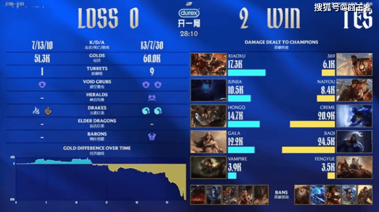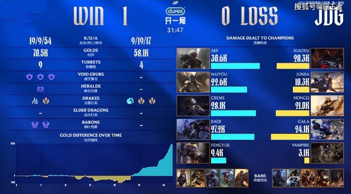 结果第一比赛,两队各打半场好局,TES笑到了最后。4分钟:Xiaoxu塞恩上路塔前抓住机会单杀369狼母拿到一血;11分钟:双方围绕小龙拉扯,JDG凭借拉扯打出一换二但是TES拿到小龙;16分钟:JDG中辅下路越塔强杀了收线的发条;20分钟:JDG进攻对方中路强杀卡莎推掉中塔;21分钟:fengyue波比闪现打断HongQ沙皇位移打出一换二;22分钟:双方小龙附近爆发团战,波比大招锤飞沙皇,发条大招拉到三人TES团战大胜拿到大龙;28分钟:fengyue波比再次大招锤飞对方中辅,TES打出一换五拿到大龙;31分钟:TES携大龙buff推上高地一波结束比赛