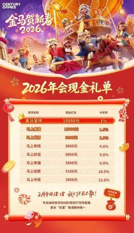 世纪华通(002602.SZ)子公司点点互动同样在年会上大方“撒钱”。消息显示,点点互动此次年会的所有奖品都将以现金形式发放,最高档奖金为18888元红包,中奖率为1%,此外,还有15000元、9999元等多档位红包发放。综合中奖率约为58%。