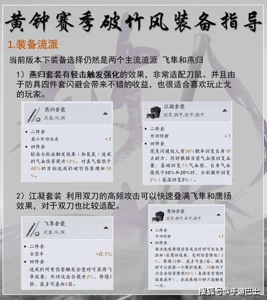 1. 新人/日常党首选:燕归套。这套套装容错率高,调律难度低,无需刻意堆会意率,适合刚接触破竹风、手法一般的玩家,日常清本、简单流派挑战完全够用,后期可花费少量玉料转成飞隼套,过渡成本极低。