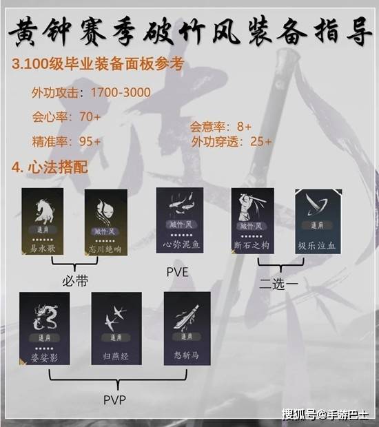 3. 剩余词条补充:在基础面板达标的前提下,可选择精准率、会意率(仅飞隼套)、小外功、大破竹(打五挑无相皇等有属性盾的副本可多堆)、小外系属性攻击(鸣金、牵丝等),按需补充即可,无需刻意追求。