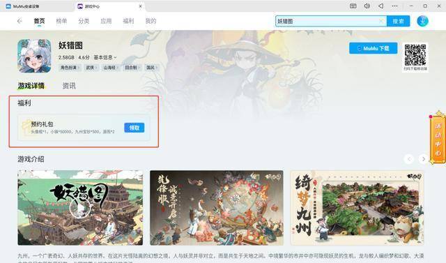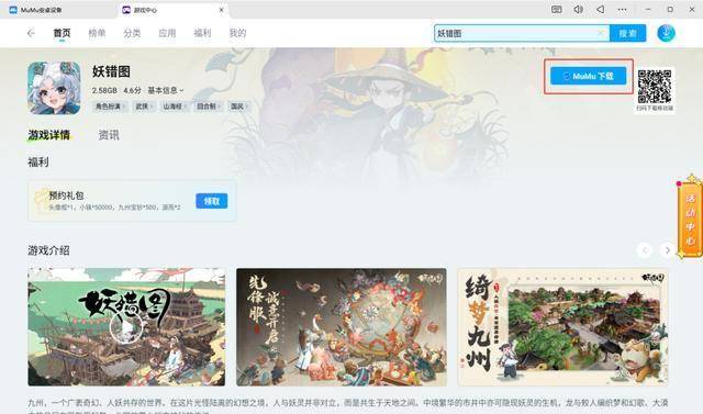 启动已安装的MuMu模拟器,在其内置的游戏中心搜索“妖错图”,点击下载并安装即可。