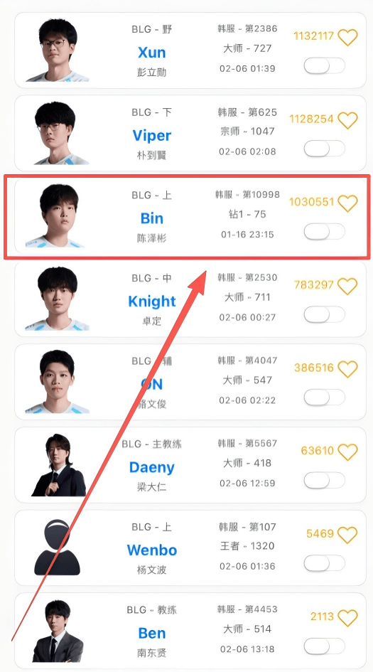 顺带一提,根据OBGG显示,从1月16日到2月6日打比赛之前,Bin都没去韩服打过排位,而BLG的其他选手包括替补上单、主教练、分析师在内,均坚持日常的排位训练。这种与团队格格不入的训练态度,也让很多吃瓜网友猜测,是否BLG真出现了内部危机。