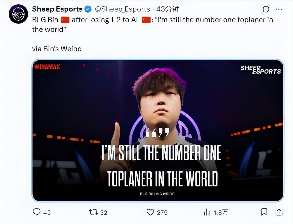 2月6日晚,因中单Knight与辅助ON的糟糕发挥,BLG以1-2不敌AL。原本赛后舆论都在指责Knight这么多年没练出一个沙皇,以及ON依旧没改掉有优势就浪、就送人头的坏习惯。可谁也没有想到,上单选手Bin突然发了一条名为“我依然是世一上”的微博,直接引来百万关注、超7.5万点赞,上万转发。