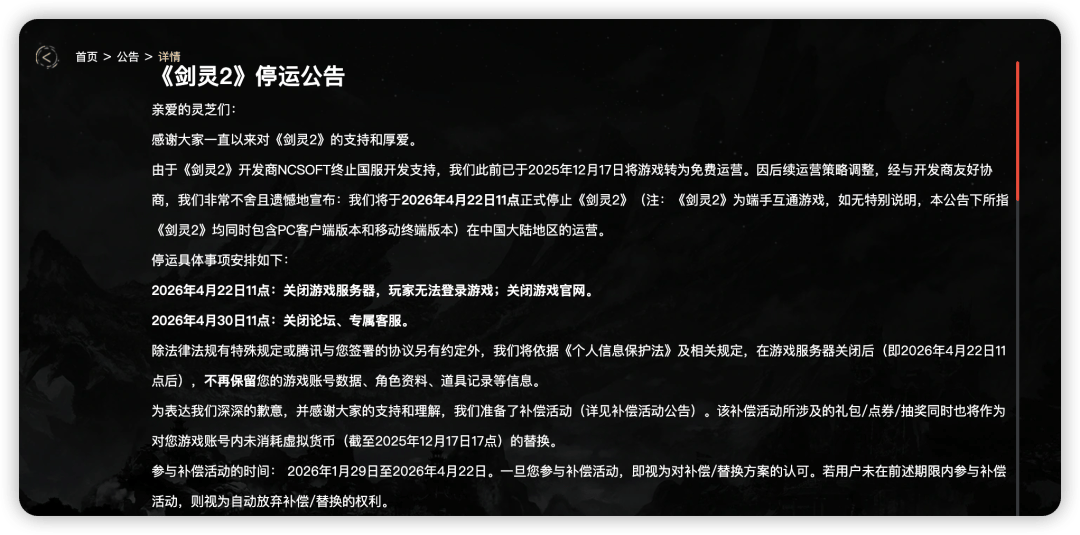 宣布其部分网络游戏服务器将于 2026 年 2 月 6 日停止运营并下架。
