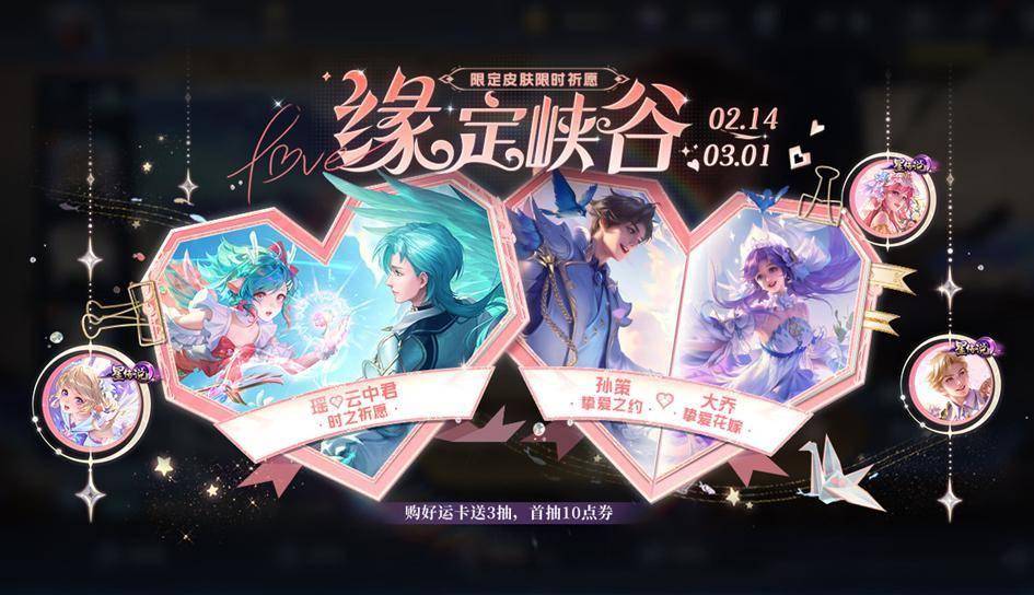 返场皮肤:孙策-挚爱之约、大乔-挚爱花嫁、瑶-时之祈愿、云中君-时之祈愿