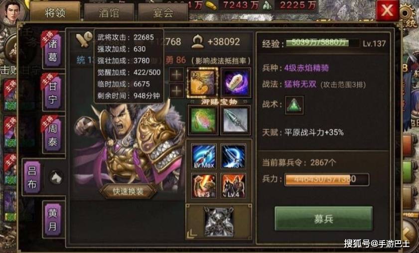 ③ 高阶适配(传奇觉醒):吕布——吕布统御、勇力双高,战法“猛将无双”可对敌方全体造成高额伤害,无视战术克制,放在锋矢阵箭头位置,能率先发动突击,配合变阵效果,短时间内就能瓦解敌方前排,是后期暴力输出阵容的核心;搭配喷火车,其无视部分防御的特性的可进一步破除敌方护甲,搭配真/烛龙套装,战力直接拉满。