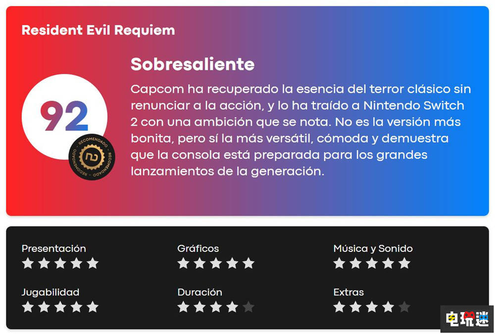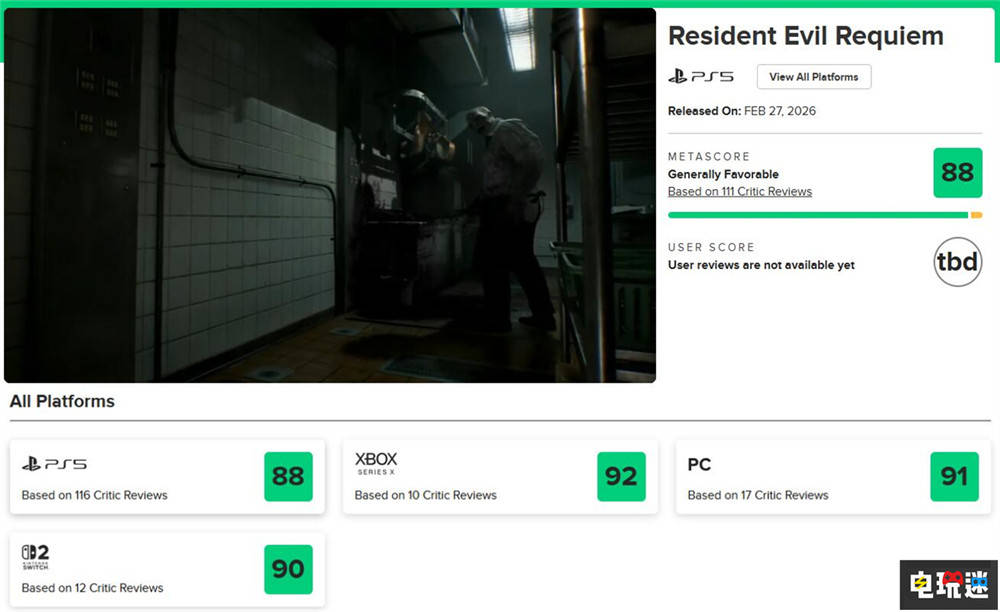 《生化危机:安魂曲》的全球媒体评分已经解禁,根据Metacritc的统计,目前《生化危机:安魂曲》PS5版本88分(107个好评,4个中评);XSX版本92分(10个好评);PC版本91分(15个好评);Switch2版本90分(11个好评)。游戏双主角双风格兼顾动作与恐怖的玩法获得了好评。