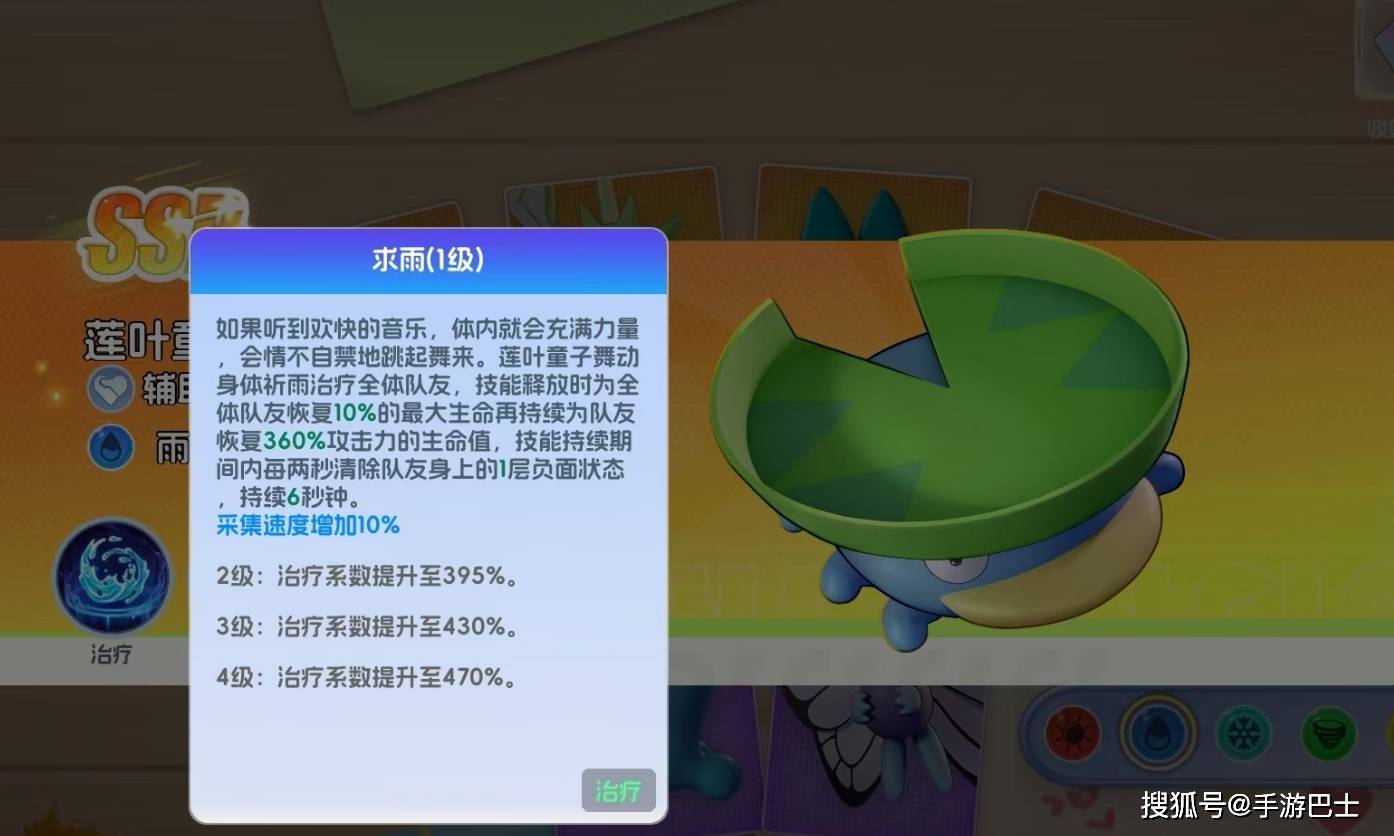 莲叶童子的核心价值在于其双属性技能组合,兼顾输出、续航和辅助,不同技能适配不同场景,升级后效果更突出,具体解析如下(含满级效果,结合进化前基础技能):
