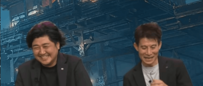在发布会上开怀大笑的两位制作人