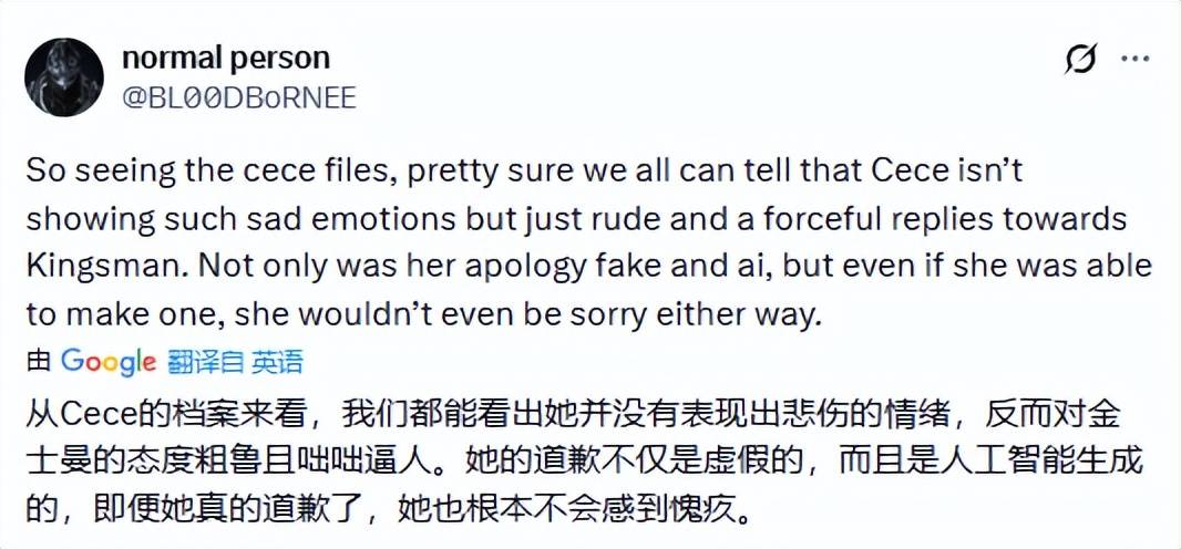 但这群人显然并不满足于此。小团体的言语攻势接踵而至,她们在社交媒体上不断对Kingsman进行人身攻击。Cece甚至语出惊人,认为Kingsman“生活不如意”就是因为他的“游戏宅”身份。