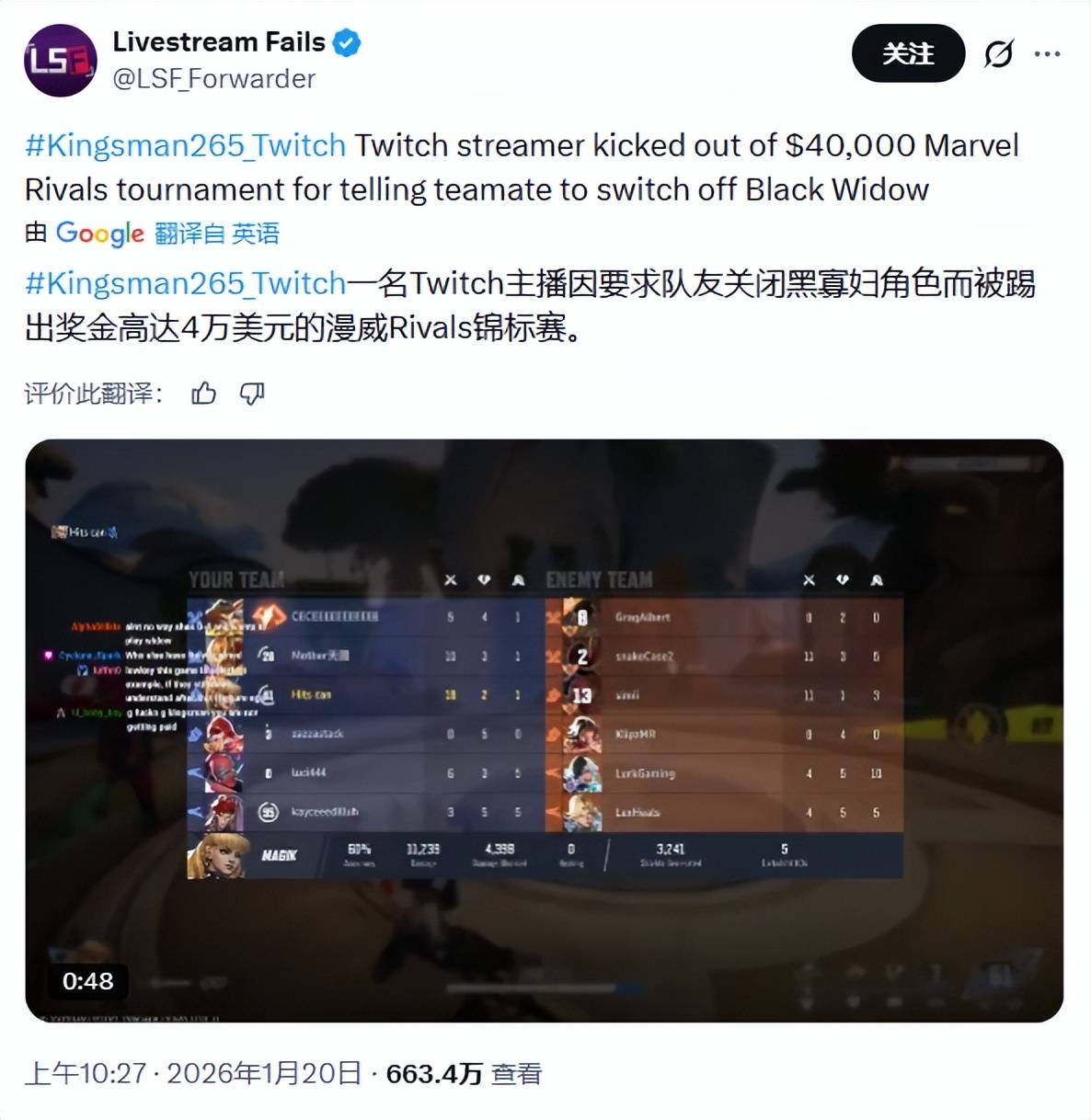 但Zazza偏不,自始至终顶着压力选黑寡妇,以至于Kingsman有点看不下去了,就苦劝她换一个英雄玩,还建议几位队友试试“三辅助”的强势套路。