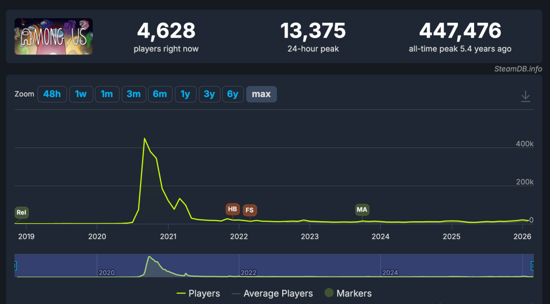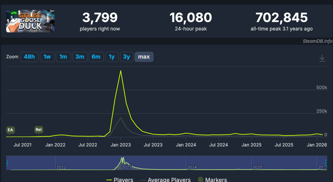 《鹅鸭杀》端游的 Steam 在线人数统计图显示,游戏上线后很长一段时间无人问津,然后某天数据直冲云霄,不久后又像自由落体般急转直下。