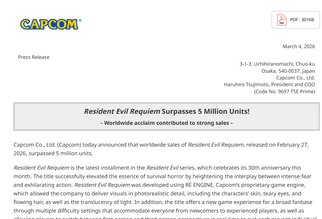 作为对比,《生化危机4:重制版》用了3个月才达到500万销量,《生化危机8》用时5个月,《生化危机2重制版》用时2年。