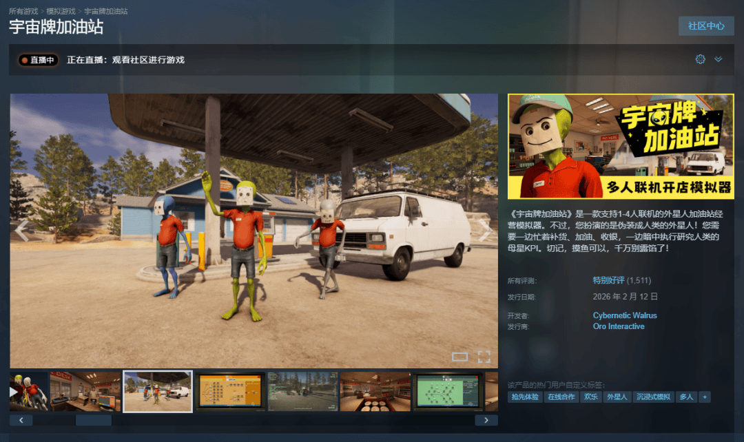 再比如,可支持4人联机,玩家需要扮演外星人伪装成人类,经营加油站的“外星牛马模拟器”《宇宙牌加油站》,2月12日开启EA后两周销量就达到了30万份。