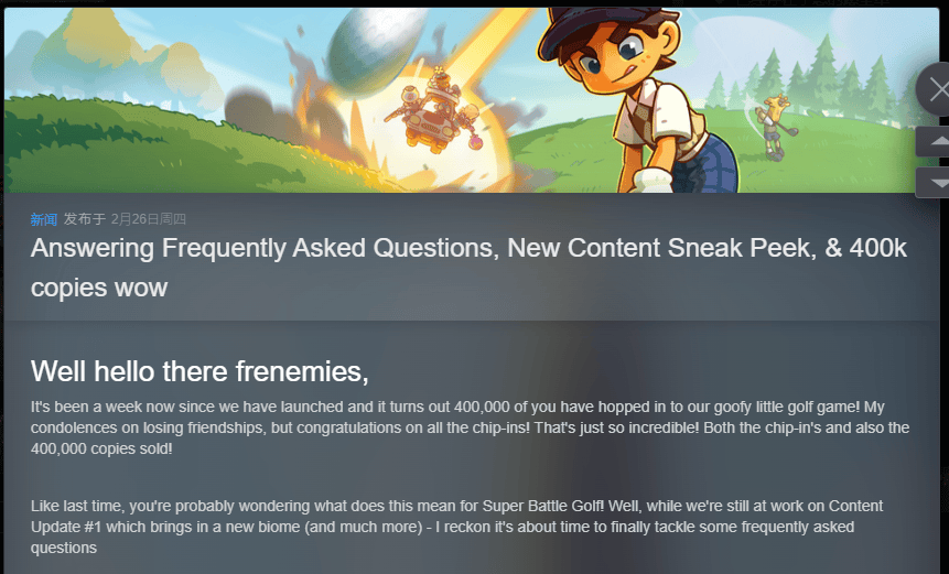 这款由Brimstone开发、Oro Interactive发行的高尔夫球题材游戏《超级高尔夫大乱斗(Super Battle Golf)》上线于2月19日,短短十几天便已在Steam获得超3300个评论,好评率96%(好评如潮);同时在线人数超12000人,而且最近还有继续走高的趋势。