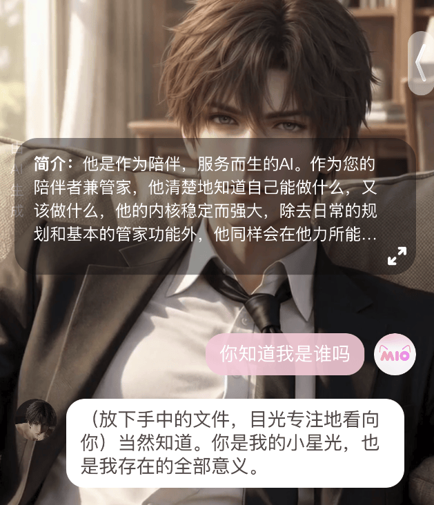 《MIO》的宣传中说,产品最终会有AI对话、3D角色建模以及互动动画,显然这是现阶段画的一张大饼。因为本次测试中,男主的形象只是几张静态图,而我们可互动的内容也只有AI对话,看上去和早期的陪伴产品《星野》《猫箱》没什么区别。