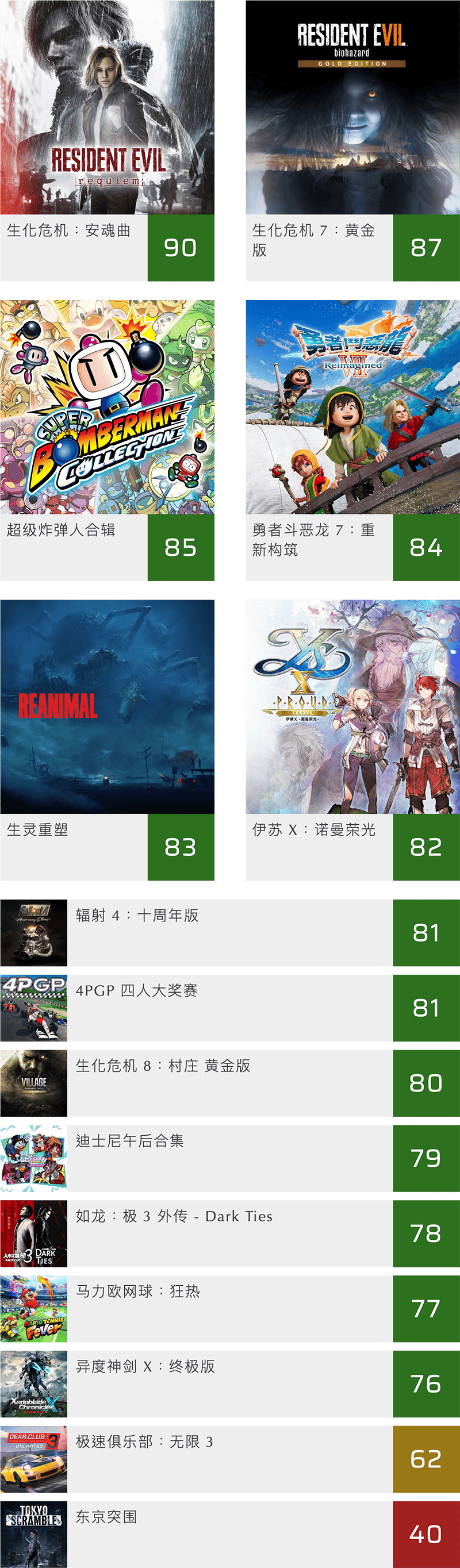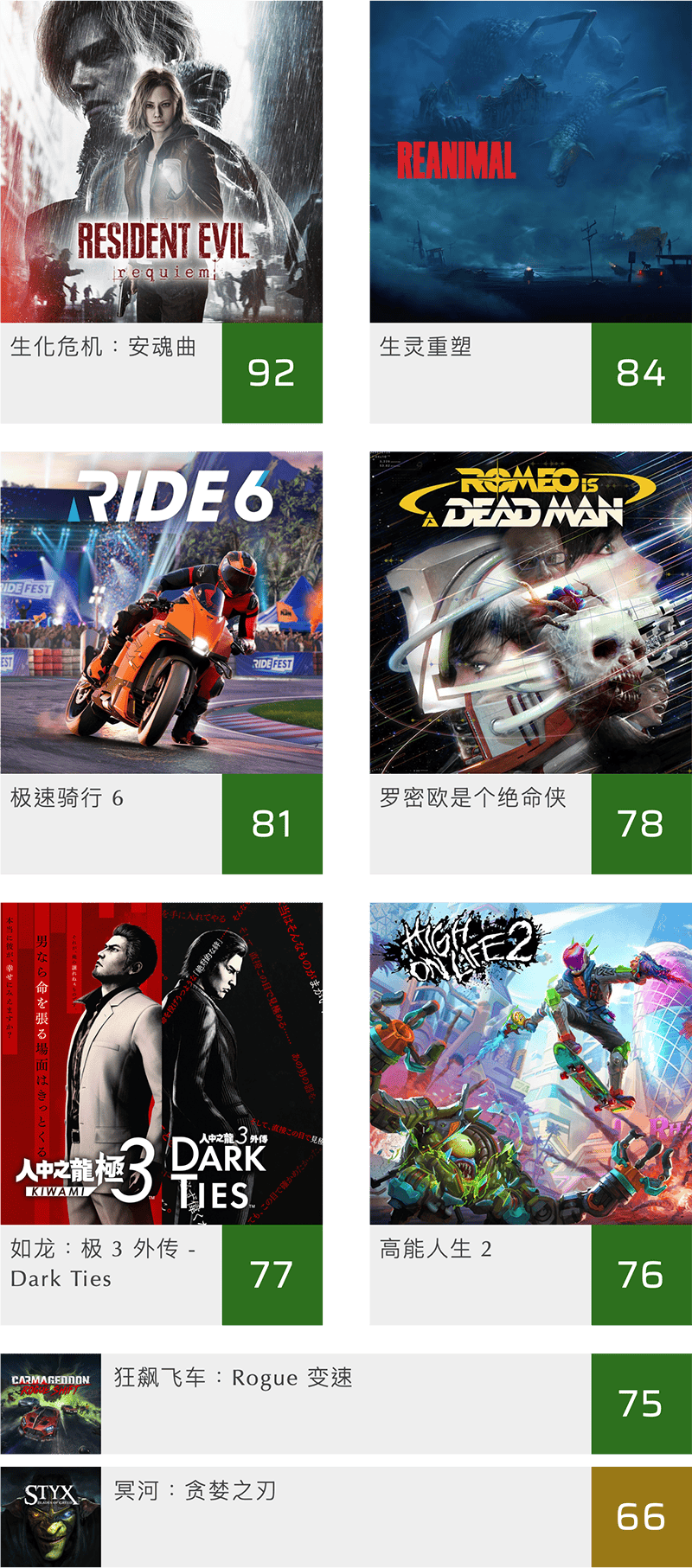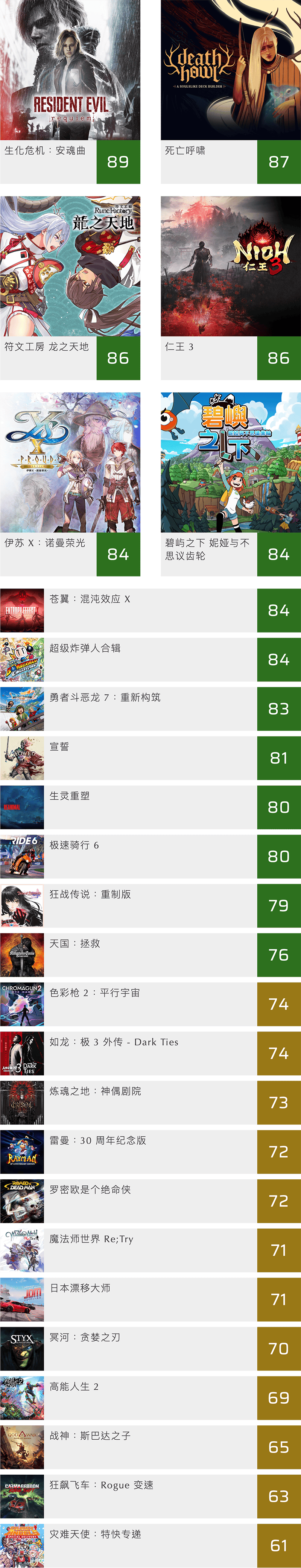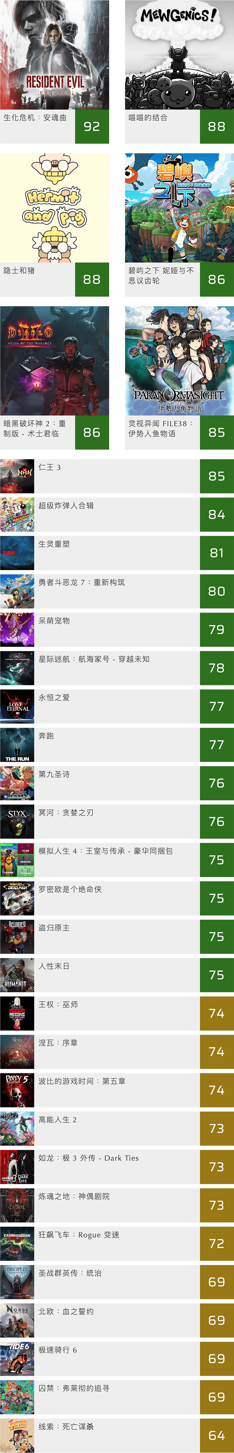 我们会在每个月初将上一个月发行,并且得到足够的媒体汇总评分的游戏在这里归纳一下。总评分来自 Metacritic 网站。我们这里列出了 PS5、Xbox Series、Switch 2、Switch、PS4、XBox One、PC 以及移动平台游戏的评分,鉴于每款游戏并不是各个平台同时发布,所以这里会见到一些老游戏的身影。
