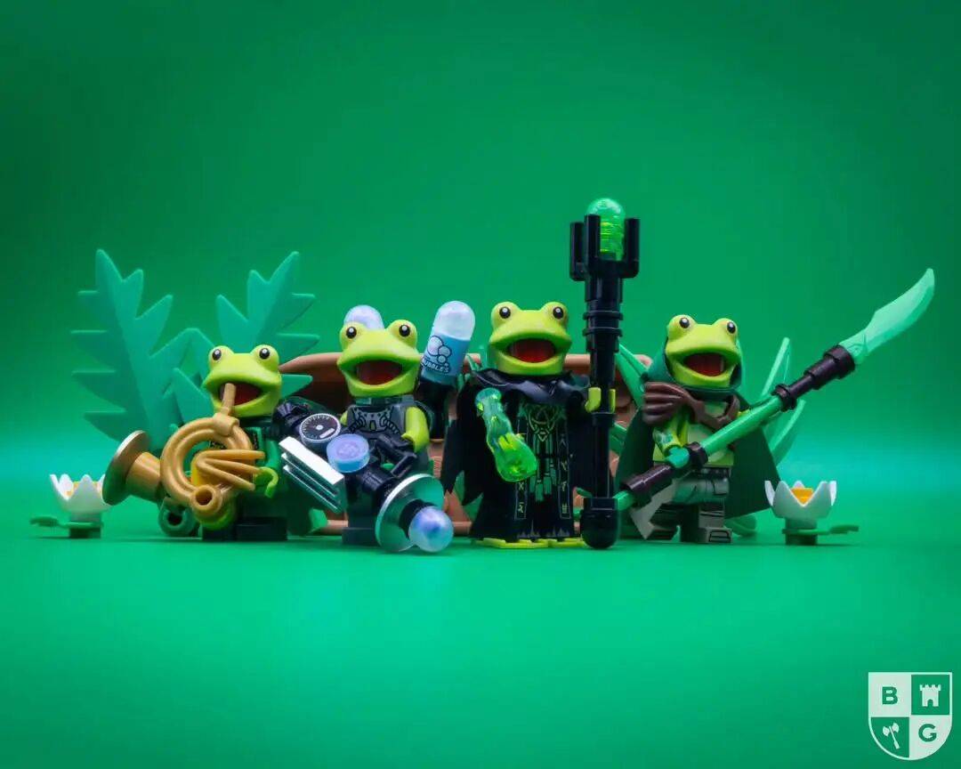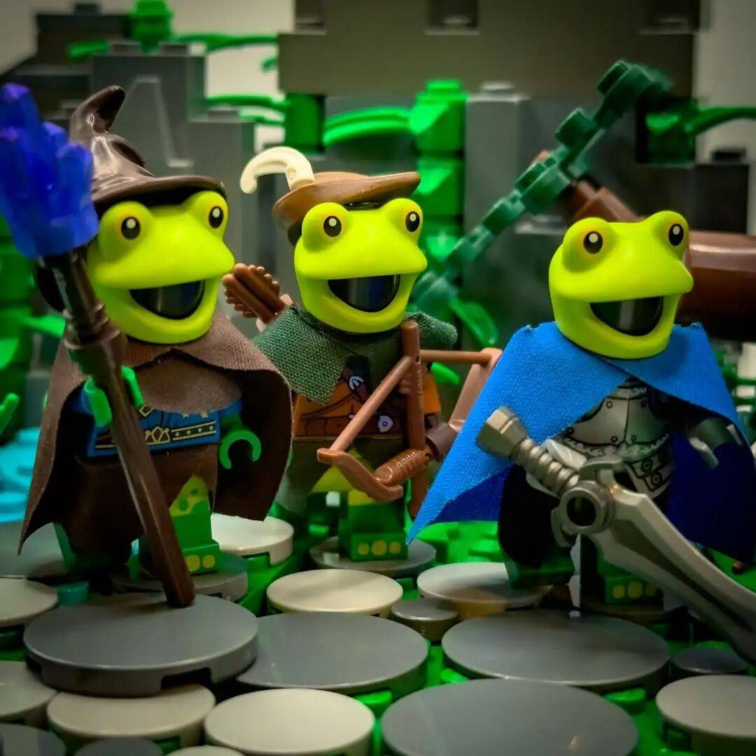 sword.bricks 不仅创作了 MOC 作品,还给它编了个背景故事:某个长满苔藓的遗迹边上,一池被太阳晒暖的蛙卵里,孵出了三兄妹——玩两栖魔法的法师 Reed the Quicktongue,射箭准到能让柳树都掉泪的神射手 Bog the PadSword,缺胳膊少腿还在拼命长回来的战士 Mire the Croakwise。