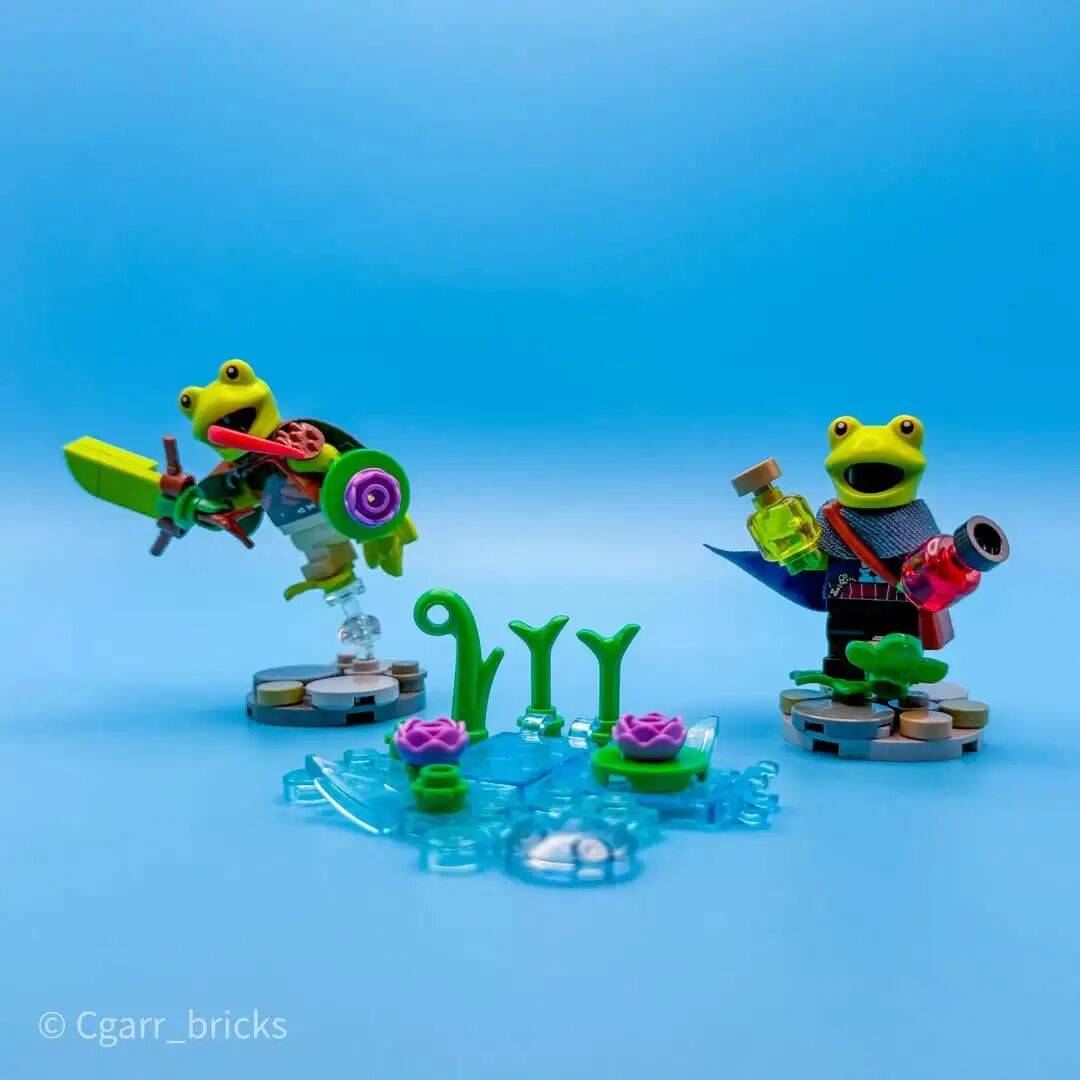 cgarr_bricks 做了一对搭档:战士 Ribert 和炼金术士 Kroak。绿剑绿盾很抢眼,底下还配了一小块池塘,让两只蛙有了回家的感觉。
