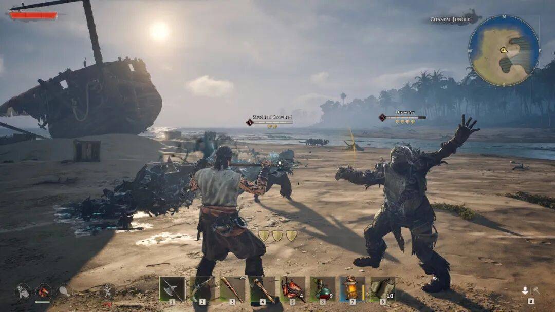 由于核心功能和传送点被锁死在海岸线上,除去和传送点互动之外,另一个开启传送的方式则是坐船。这样一来,内陆和海岸线的关系完全倒转了,离岸边越远就越凶险,从内陆跑回大海就能回家。大海成了避风港,陆地反而变成了充满变数的副本。